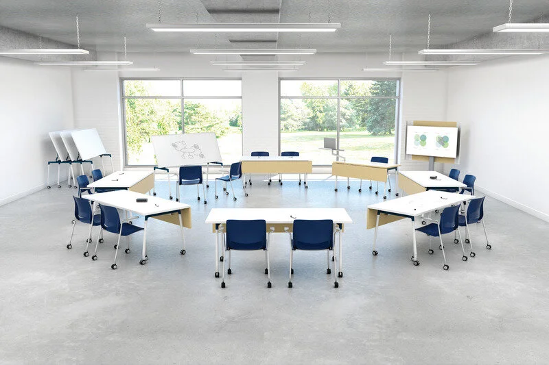 Thesis is designed to meet the evolving trends in education, mirroring the changes seen in office environments. Educational institutions are experiencing a shift in learning and interaction styles, and Thesis addresses this by creating collaborative spaces for group work or conversational applications. It can also be pulled apart to offer independent learning alternatives. It features school chairs that cater to flexible seating needs.